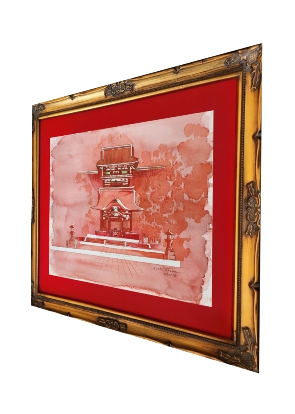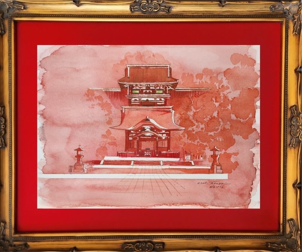 鎌倉の鶴岡八幡宮へ。太鼓橋、三の鳥居を越え 本宮、舞殿を正面から見る風景を水彩絵具で描きました。
