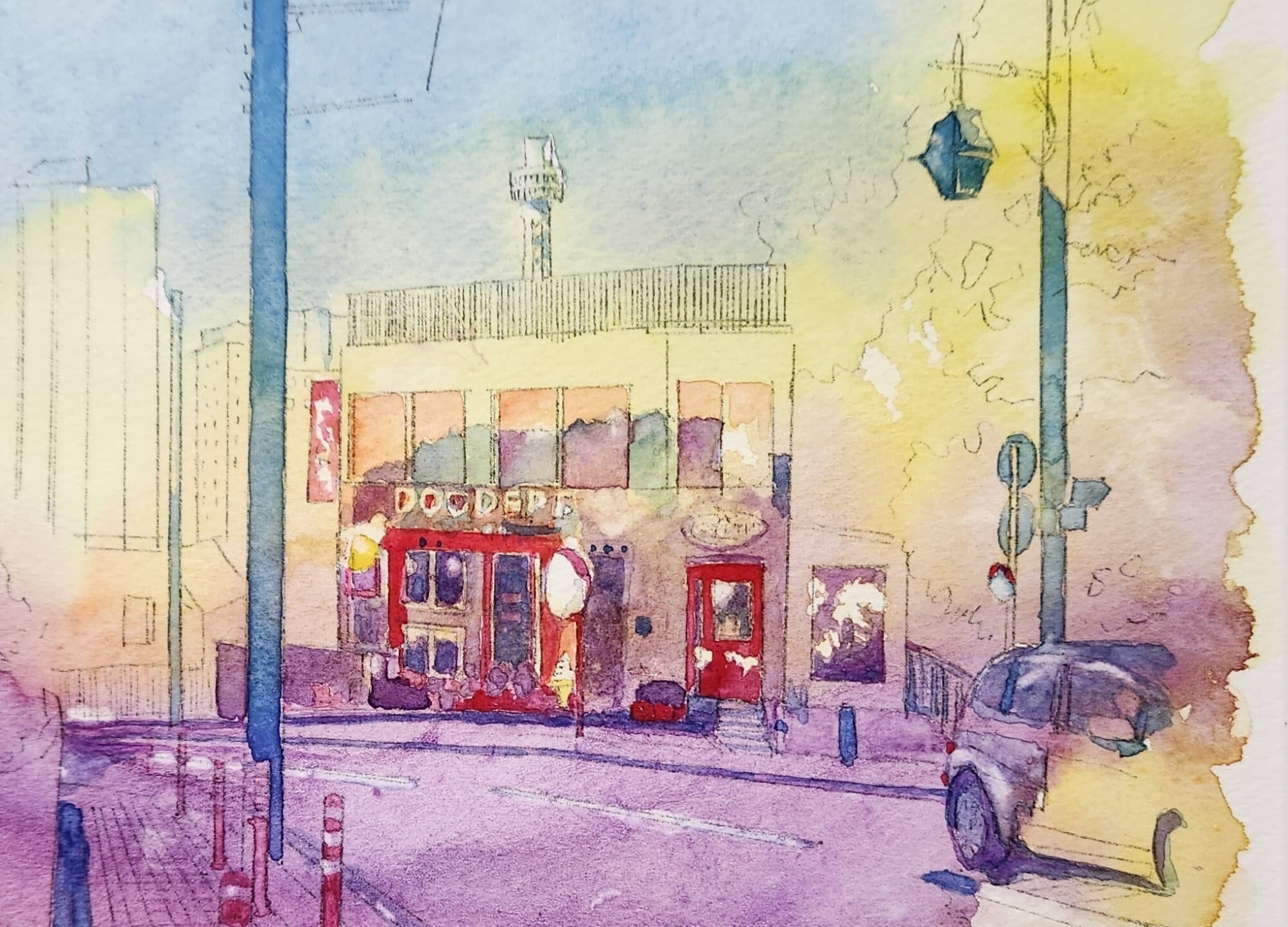 43.0×34.0×1.5cm ※額のサイズで表記しています。ホワイトワトソン紙に水彩絵の具で制作しています。横浜山の手から谷戸坂を下っているところマリンタワーが見える風景画です。