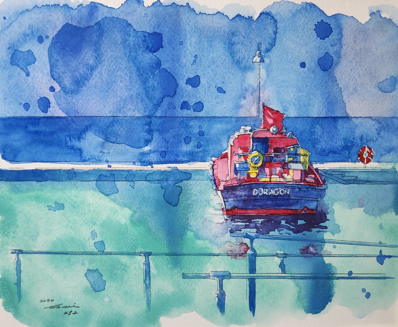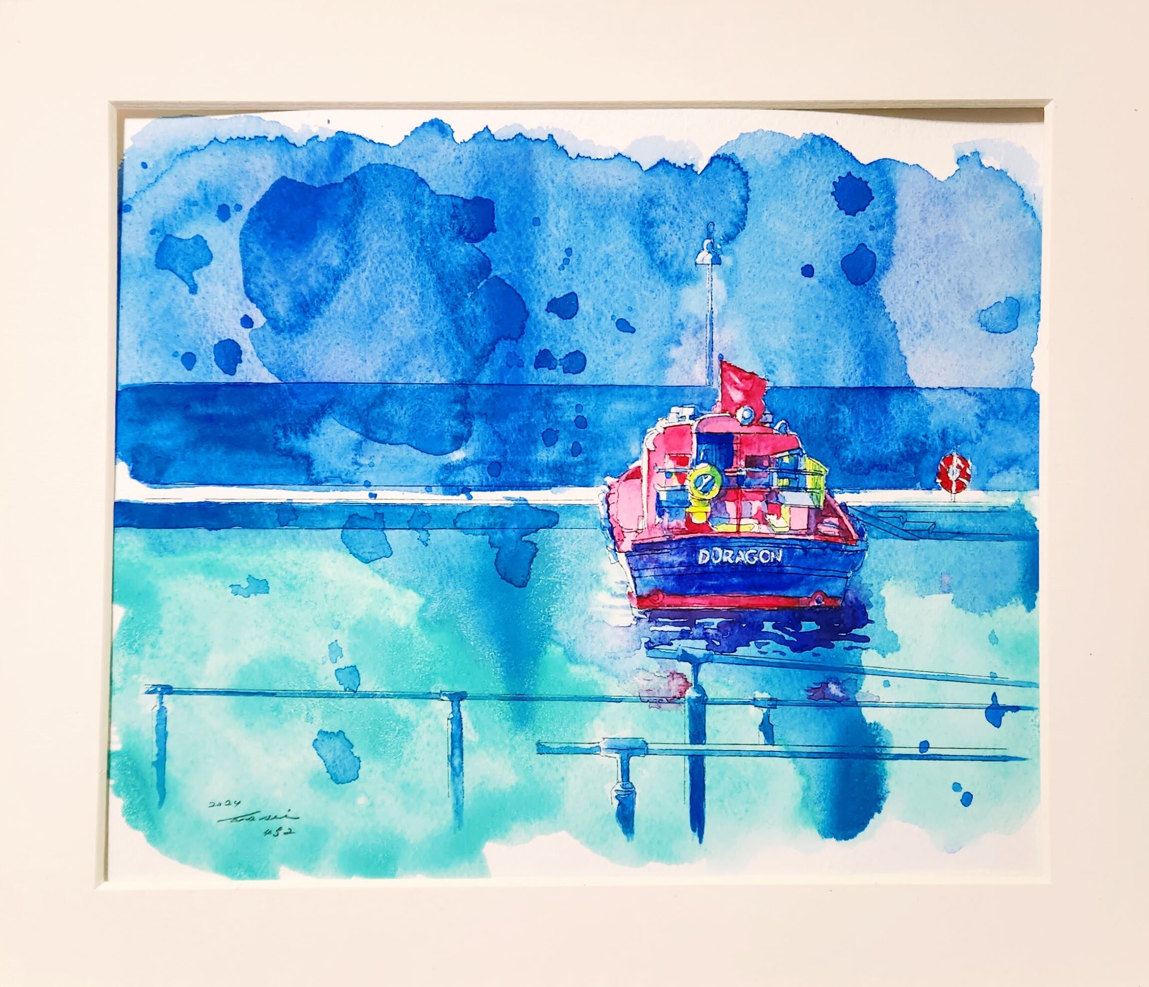 43.0×34.0×1.5cm ※額のサイズで表記しています。ホワイトワトソン紙に水彩絵の具で制作しています。横浜市役所から見た入り江に浮かぶ船がある風景画です。